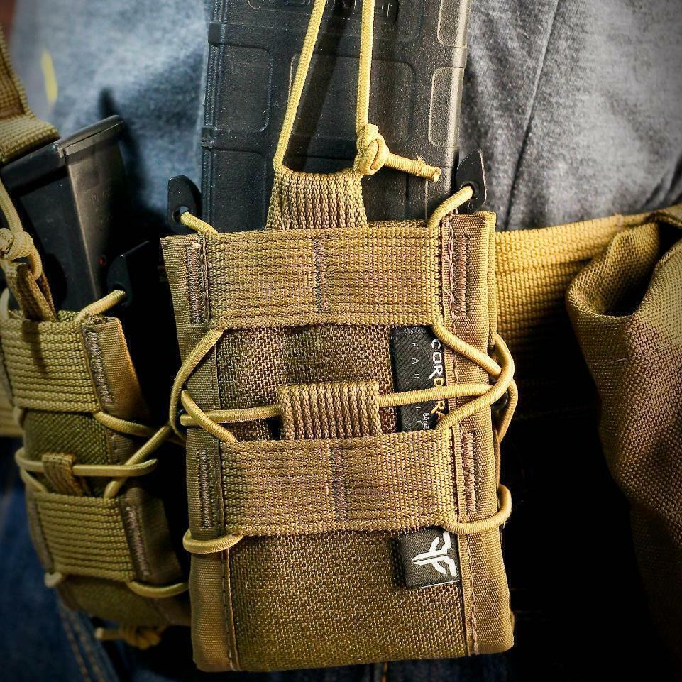 Possui ajuste de altura por elástico roliço de 4 mm, na mesma cor do equipamento, permitindo que o próprio operador regule a altura do carregador conforme sua preferência.O sistema de fixação é baseado em M.O.L.L.E., utilizando fitas 100% poliéster de 25 mm, costuradas com linha de nylon, garantindo alta resistência e durabilidade.